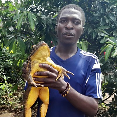The world's largest frog - the so-called Goliath frog - is under threat. It is mainly found in Cameroon and Equatorial Guinea where it has been over-hunted for food and the pet trade. Its habitat near rivers and streams is being destroyed and the frog is now classified as endangered on the official extinction Red List. The frog is little-known to science; even in its native Cameroon, many local people are unaware of its value to the ecosystem, such as preying on the insects that damage crops. Cedrick Fogwan is from the Goliath Team Conservation group in Cameroon. He told the BBC more about the world's largest frog. (Picutre: Cedric Fogwan holds aloft one of the record-breaking goliath frogs Credit: JEANNE D'ARC PETNGA)