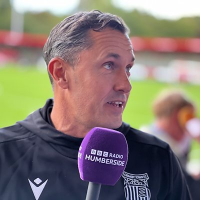 Paul Hurst speaks to John Tondeur following their defeat against Hartlepool United.