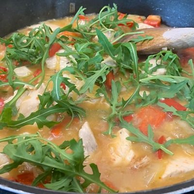 Cajun Chicken Ingredients • 2 red onions • 3 mixed-colour peppers • 4 chicken legs, skin on, bone-in • 1 tablespoon Cajun seasoning • 4 cloves of garlic • olive oil • red wine vinegar • 1 mug of orzo pasta • 4 tablespoons natural yoghurt Method Preheat the oven to 200°C/400°F/gas 6. Peel and halve the onions. Tear up the peppers into big chunks, discarding the seeds and stalks. Place it all in a 35cm x 25cm roasting tray with the chicken, Cajun seasoning and whole unpeeled garlic cloves. Drizzle with 1 tablespoon each of olive oil and red wine vinegar, season with black pepper and toss well, turning the chicken skin side up. Roast for 40 minutes. Boil the kettle. Remove the tray from the oven and mash the soft garlic cloves into the tray juices, discarding the skins. Around the chicken, pour in 1 mug of orzo and 2 mugs of boiling kettle water (600ml). Carefully cover with tin foil and return to the oven for 20 minutes, or until the rice is fluffy and the chicken pulls easily away from the bone. Season to perfection, then serve with dollops of yoghurt, a pinch of black pepper, and a drizzle of extra virgin olive oil, if you like.