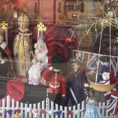 Scott Page's mum Wendy.... who's had her knitting needles out to create an entire display of royal characters enjoying a coronation tea party for Scott's bakery in Narborough