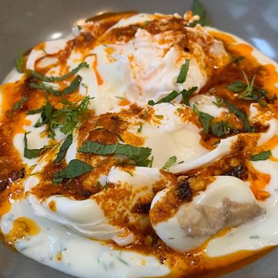 Turkish Eggs (Cilbir) Ingredients: - 200g Greek yoghurt - Few fronds of fresh dill - 8-10 mint leaves - 1 garlic clove - 2 eggs -1 tablespoon vinegar - 55 g butter - 1 teaspoon chili flakes - 1 teaspoon smoked paprika - Salt and pepper to taste Instructions: - Finely chop the dill and mint, crush or grate the garlic clove and combine the ingredients with the Greek yoghurt. Season with salt and pepper and leave aside. - Fill a deep pot with water and bring it to the boil. Add 1 tablespoon of vinegar and create a vortex. Crack the egg and add it to the middle of the vortex. - Cook as desired. Remove the egg with a slotted spoon and leave aside while you cook the next egg. - Using a pan, melt the butter. When the butter starts to bubble add the spices. Stir until well combined and the sauce will be ready to serve. - Transfer the Greek yoghurt into the serving bowl. Place the eggs on the top and pour the chili sauce. Sprinkle some extra dill and mint on the top.