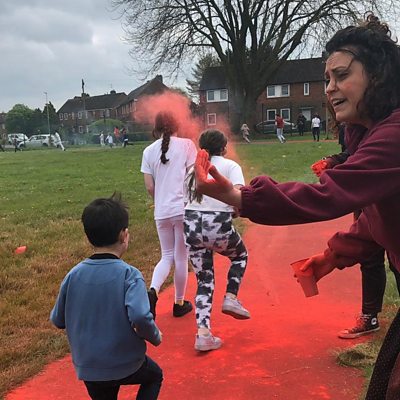Leicestershire primary school children have been enjoying an afternoon of being covered in paint. Fortunately for mums and dads it wasn't wet paint! 6 thousand children were taking part in the first ever 'colour dash' with the involvement of 25 local schools. The children have been running onto their school field while their teachers throw coloured paint over them. It's all for a good cause - raising money to help disadvantaged children in our community. Reporter Sara Palmer went along to Parks Primary school in Leicester to find out how it all went.