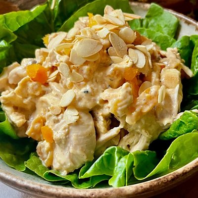 Coronation chicken • Half a cold cooked chicken, bones and skin removed and chopped into bite sized chunks • 100ml good mayonnaise • 100ml Greek yoghurt • 1 heaped tablespoon mango chutney • Handfull dried apricots chopped into small pieces • 4 inch stick fresh ginger • 1 heaped tablespoon mild curry powder • 2 tablespoons flaked almonds 1. Gently warm the curry powder in a pan until you smell the spices, careful not to burn them. 2. Tip warmed spices into a big bowl, add the almonds to the same pan and gently toast until just turning golden, then set aside. 3. Coarsely grate the fresh ginger then squeeze the juice into the bowl with the curry powder 4. Add the apricots, mayonnaise and Greek yogurt, mango chutney and mix, fold in the chicken. 5. If you can leave the mix in the fridge for a couple of hours or overnight this would be great. 6. When ready to serve, top with the toasted almond slivers.