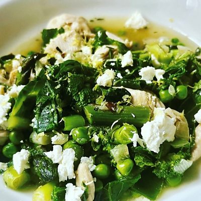 Food Thursday - spring green chicken with feta. An incredibly versatile dish that uses whatever green veg and herbs you have to hand and ready in just 10 minutes. All measurements are approximate, go with what you have lying around in the fridge/freezer. You want the veg to be just cooked and al dente rather than mushy! Ingredients: • 2 tbsp olive oil • 1 handful diced onion • 2 chicken breasts, sliced into chunks • 1 tbsp chicken stock powder (or one stock cube) dissolved in freshly boiled water • Freshly grated black pepper • 1 handful broccoli florets • 1 handful asparagus, chopped into bite sized pieces • 1 handful spring greens, chopped • 1 handful frozen peas • 1 handful chopped spring onions • 1 handful lettuce, chopped • 1 tbsp dried tarragon To serve: • 1 tbsp feta, crumbled • Few torn mint leaves • Zest of lemon Method: 1. Heat your olive oil in a large saucepan then add the onion and cook until soft but not turning brown. Add diced chicken and cook for a couple of minutes whilst stirring. Add pepper. 2. Pour over enough hot chicken stock to cover the chicken and cook for a few minutes until the chicken is cooked through. 3. Add the broccoli and cook for one minute then add the asparagus, spring greens, peas and spring onions. Cook for one minute then add the lettuce and tarragon. 4. Plate up in a bowl then crumble over the feta, garnish with mint, then zest some lemon over the top.