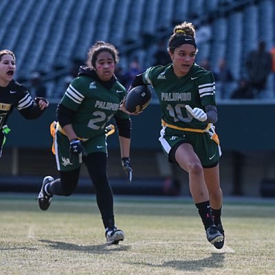 Philadelphia Eagles are helping keep girls involved in sport by investing in Flag Football and the support of over 30,000 sports bras. The league the NFL team set-up in 2022 has now grown to 52 teams with the goal to make girls' flag football an officially sanctioned sport in the state of Pennsylvania. Key to their strategy is making sure girls have the right equipment - including sports bras. They have launched Operation Warm to give out over 30,000 sports bras to athletes in need this year. Palumbo Lady Griffins player Ruth Duink and her coach Chris Donnelly speak to Sportshour about the impact this has had. (Photo: Palumbo Griffins playing at Lincoln Financial Field, the home of the Philadelphia Eagles. Credit: Philadelphia Eagles)