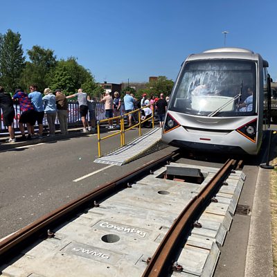 Plans for a very light rail system in Coventry are being developed. And for the first time, the train has been on the street in Coventry for members of the public to see. The zero emission battery electric prototype is designed as a cheaper option to trams. BBC CWR presenter Vic Minett has been talking to Coventry City Council's Cabinet Member for Jobs and Regeneration and Climate Change, Jim O'Boyle.