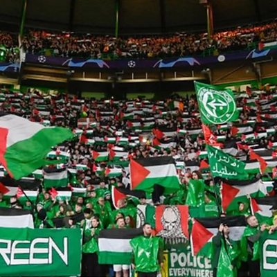 Cefnogwyr Celtic yn herio'u clwb wrth chwifio baneri o gefnogaeth i Balesteina