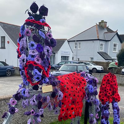 James chats to Joy Mcdonald - one of the group behind the woollen memorial.