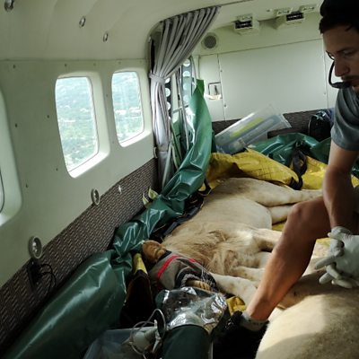 Wildlife vet Joel Alves has shared video online of him sitting in the back of a light aircraft with a pair of tranquillised lions between his legs - while airborne at 10,000 feet over South Africa’s Kruger National Park. Joel, who works with WildScapes Veterinary and Conservation Services, explains to Newsday how transporting the lions via air is often the most efficient way to get them to a location where they can receive the treatment they need. Joel regularly shares videos like this with his 160,000 social media followers, offering them a window into the world of African wildlife conservation. "We move these lions around to maintain a genetic diversity across the landscape. Unfortunately the road networks or the trips themselves can be extremely long and challenging, so sometimes it's a lot quicker to pop them in the aircraft, keep them sleeping, and you can cover a great distance in a much shorter space of time," says Joel. He adds: "We trust the drugs, the lions should not be waking up... there might be a bit of movement and your heart will be in your mouth... but you can certainly control the situation." (Image: Joel Alves with a sedated lion in a light aircraft. Credit: Kate Church)