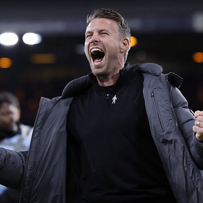 Rob Edwards reacts after the Hatters beat Brighton 4-0 at Kenilworth Road.