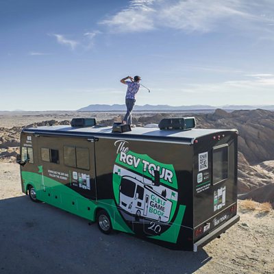Meet Patrick Koenig, the professional golf course photographer and now proud record holder for the most rounds of golf played in a calendar year when he completing 580 different courses in 365 days. He told Sportshour's Caroline Barker how it gave him a new perspective on life and the USA. Photo: Record breaking golfer Patrick Koenig playing a golf shot while stood on top of his motorhome (Credit: Patrick Koenig)