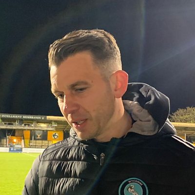 Wycombe boss Matt Bloomfield reacts after drawing 1-1 away against Cambridge United.