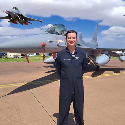 A real life Top Gun fighter Pilot talks Matt Tancock through his F16 jet as it celebrates 50 Years of operation