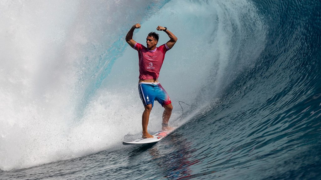 Kauli Vaast has gone from watching the Olympics with “stars in his eyes” to winning men's surfing gold on his Tahitian home waves at Teahupo'o. The 22-year-old won Olympic gold with a score of 17.67 to beat Australia’s Jack Robinson in the final – with the Paris 2024 surfing competition held nearly 16,000 kilometres (9,950 miles) from the French capital in Tahiti. After winning gold he travelled to Paris where he surfed along the River Seine and Vaast tells Sportsworld’s Delyth Lloyd all about that and his Olympic gold. Image: Kauli Vaast of Team France reacts as he exits a wave during the men's gold medal match of surfing on day nine of the Olympic Games Paris 2024 on August 05, 2024 in Teahupo'o, French Polynesia. (Photo by Sean M. Haffey/Getty Images)