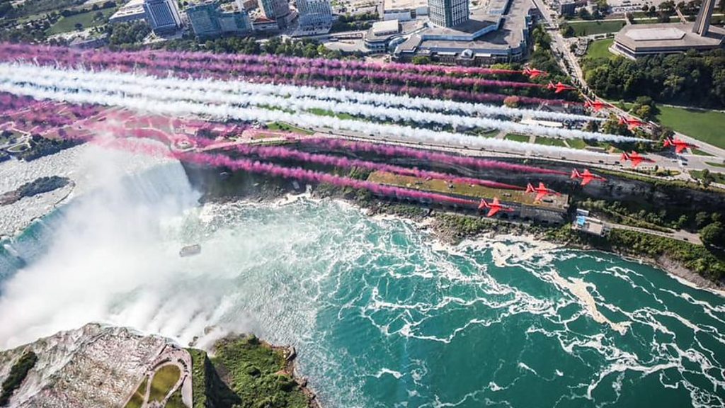 Corporal Phil Dye and Squadron Leader Graeme Muscat talk to Flight Lieutenant Amy Casey about the photo chase. The aerobatic display team are in Canada for a five-week tour to help mark the Royal Canadian Air Force’s centennial.