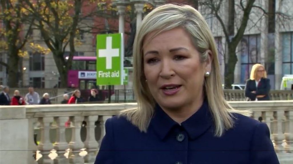 First Minister Michelle O'Neill becomes first senior Sinn Féin figure to take part in an official Remembrance Sunday ceremony