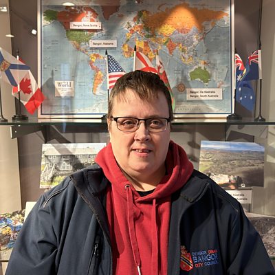 Y Cynghorydd Eirian Williams Roberts sy'n arwain Aled o amgylch arddangosfa newydd Storiel am yr amryw drefi neu ddinasoedd o'r enw Bangor sydd 'na ar draws y byd.