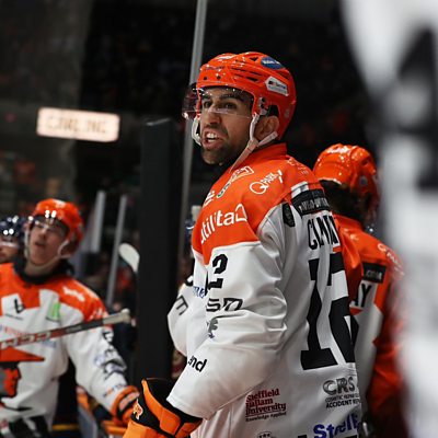 Sheffield Steelers forward Daniel Ciampini speaking to Peter Spencer, after their 4-3 win over Cardiff Devils.