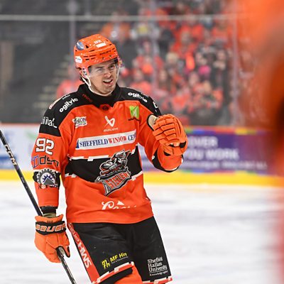 Sheffield Steelers winger Mitchell Balmas speaking to Peter Spencer, after their 3-2 penalty shot win over Cardiff.