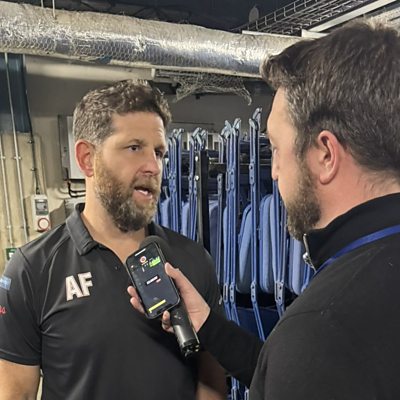 Sheffield Steelers head coach Aaron Fox speaking to Peter Spencer, after 4-3 overtime loss to Nottingham Panthers in Elite League play-off semi-final.