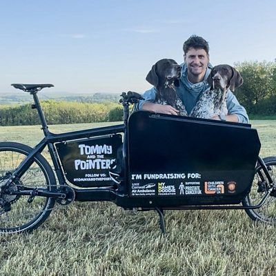 A man a bike and two dogs in a basket on a mission for charity