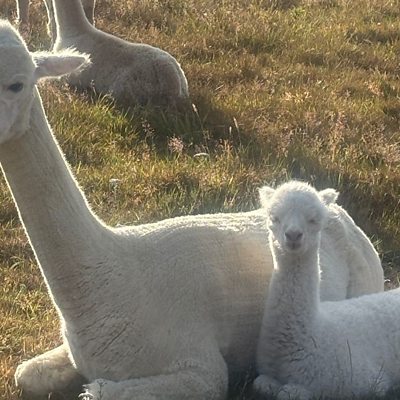 Jackie from Beacon Alpacas explains why she's named a newborn alpaca 'Georgey Spanswick'.