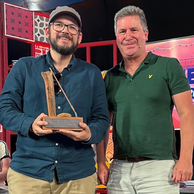 Gruffudd Owen - enillydd Tlws Coffa Dic Jones 2025 - cywydd gorau'r gyfres. Y testun oedd cywydd gofyn unrhyw arf neu arfau