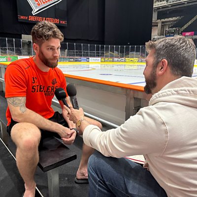 Sheffield Steelers netminder Eamon McAdam speaking to Peter Spencer, after their 2-1 win over Fife Flyers.