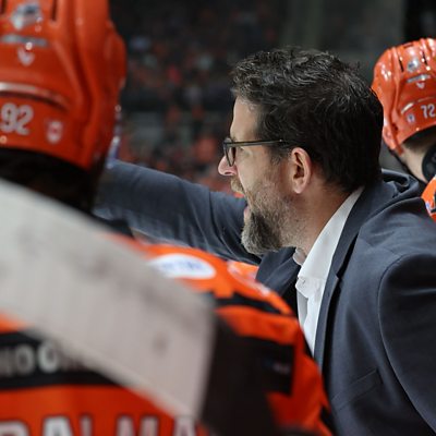 Sheffield Steelers head coach Aaron Fox speaking to Peter Spencer, after their 5-0 win over Manchester Storm.