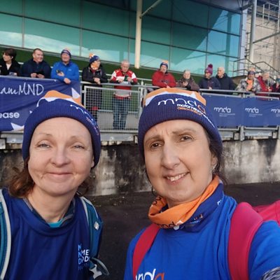 Dwy chwaer yn rhedeg gyda Kevin Sinfield i godi arian i ymchwil motor niwron, er cof am Bob, gŵr Lowri Davies