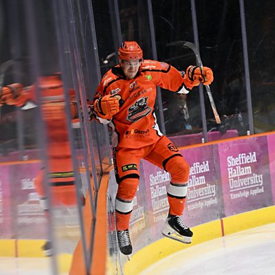 Sheffield Steelers winger Mikko Juusola speaking to Peter Spencer, after scoring in their 3-1 defeat to Coventry Blaze.