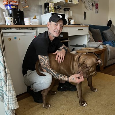 Kevin Hodges lives in a Jimmy's modular home in the city with his dog Ruby.
