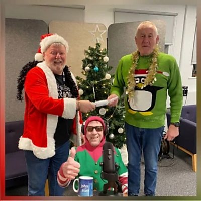 Dilwyn Morgan sy'n ymuno â pharti Nadolig John ac Alun