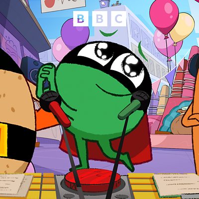 DJ Carrot introduces a new feature on the Tato Radio Show where fruit and veggies have recorded messages remembering their favourite Supertato Moments – stories from when Supertato has helped them out. But Evil Pea plots to change the endings of the stories to make Supertato sound like a baddie!
