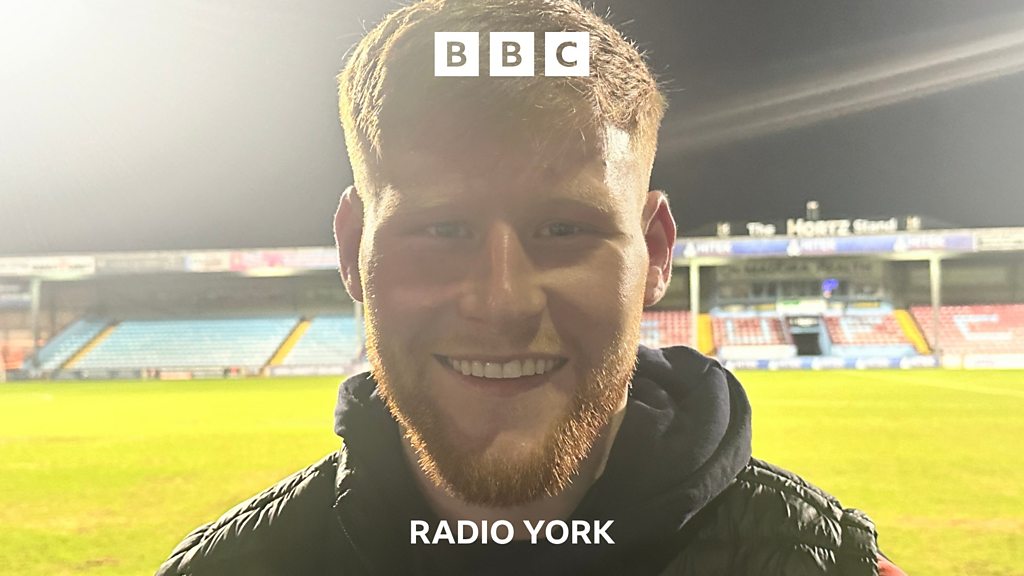 York City forward Josh Stones speaking to David Ward, after a 3-0 victory away at Scunthorpe United. The result sent the Minstermen top of the National League.