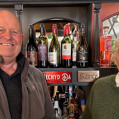 Alun Jones ac Ann Anderson yn sgwrsio o dafarn Gwesty'r Tŷ Gwyn, Rowen