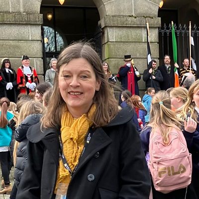 Nia Robertson a Sam Ruane-Brown yn sôn am ddathliadau Dydd Gŵyl Piran yng Nghernyw.