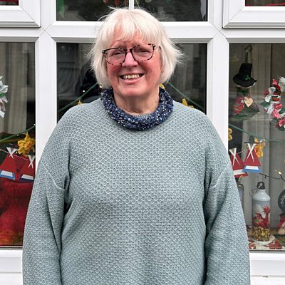 Ann P Williams yn sgwrsio am addurno ei ffenestr liwgar yng nghanol y pentref