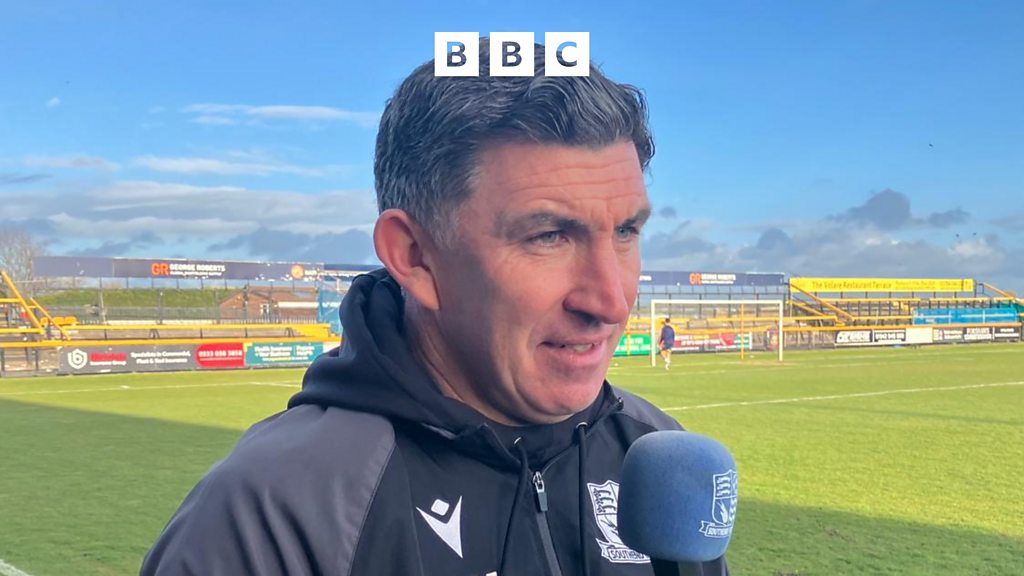 The Southend United head coach Kevin Maher after securing a trip to Wembley in the FA Trophy Final. The Blues beat National League North side Southport 3-1 and they will face Wealdstone in the final on the 17th May. (Image credit: Warren Muggleton/BBC)