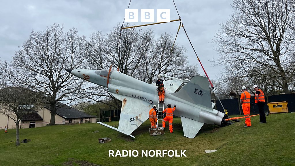A replica of an F-5 Tiger Jet is moving from its iconic home at RAF Alconbury in Cambridgeshire to Sculthorpe Heritage Centre. John Devine went to watch the move. Photo credit: John Devine / BBC