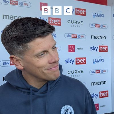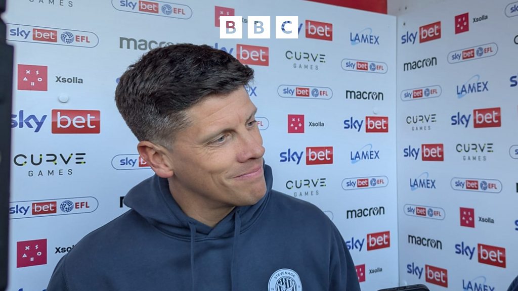 Alex Revell reacts after Stevenage beat Blackpool 1-0 to move into the play-off places. Image: BBC
