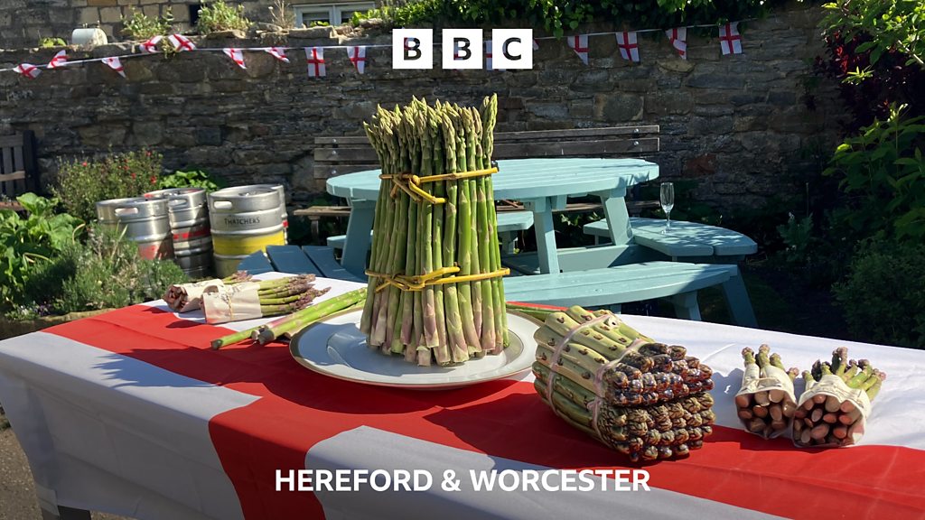 Hundreds came out to celebrate the first spears of the season in Bretforton, including dancers, schoolchildren and Gus the Asparagus Man. Tradition dictates the first crop in the Vale of Evesham is not harvested until St George's Day. Kalpana Boodhoo reports.