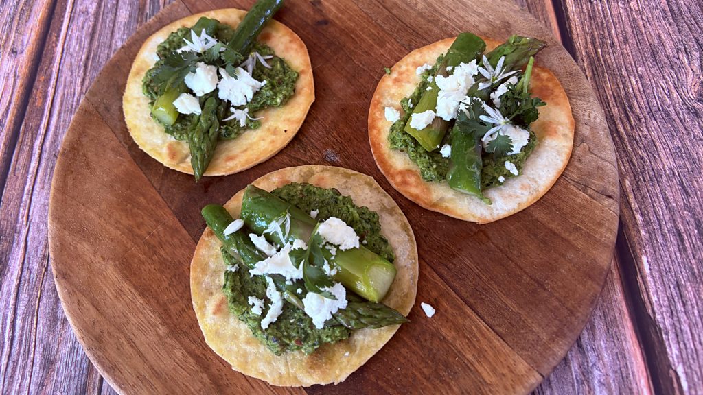 Wild garlic mole 1 tablespoon oil 1 shallot, finely chopped 1 clove garlic, minced Handful wild garlic leaves, shredded Handful coriander chopped 75g purple sprouting broccoli 2 green chillis, deseeded and chopped 2 tablespoons pumpkin seeds Zest and juice 1 lime 50ml olive oil Shred the broccoli and cook in boiling salted water for a minute. Drain and cool. Cook the onion and garlic in the oil until soft and add the chillis. Cook for a minute. Place the mixture in a jug and blend with the wild garlic, coriander, broccoli, pumpkin seeds, lime juice and zest and oil. Check seasoning. Tostadas 6 soft flour tortillas Oil for cooking Cut 3 rounds out of each tortilla. Fry in oil until crisp and set aside. Grilled asparagus 8 asparagus stems Oil for brushing 75g feta cheese crumbled Bring a pan of water to the boil and season with salt. Trim the tough bottom of the asparagus and add to the water. Cook for about 3 minutes – check if a knife goes in. Drain, brush with oil and cook on a grill pan to mark. Cut the stems into 4 slices Spoon some mole onto the tostadas and top with asparagus and crumble of feta.
