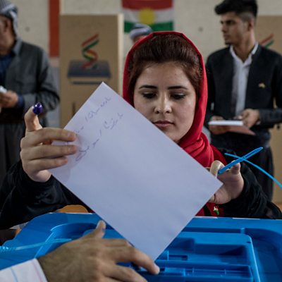 Voters are jubilant as they go to the polls, but Baghdad opposes the vote. We get the latest from the BBC's Jiyar Gol in Erbil. We get reaction from Berlin following Angela Merkel's re-election as German chancellor. Fergus Nicol is joined throughout the programme by Jason Abbruzzese of Mashable in New York and by Andrew Peaple, deputy Asia finance editor for the Wall Street Journal, in Hong Kong. (Picture: A woman casts her referendum vote at a voting station in Erbil, Iraq; Credit: Chris McGrath/Getty Images)