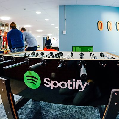 Spotify will launch shares on Wall Street valuing the company at up to $23bn. And it is not using an investment bank or underwriter for all this - it is doing what is called a direct listing. The Swedish streaming company has never made a profit since it was founded in 2008. We ask Mark Mulligan, managing director of MIDiA Research, if it is worth its lofty valuation. Dick's Sporting Goods has announced it will stop selling assault-style rifles. Christopher Svezia, a retail analyst with Wedbush Securities, explains what impact this might have. Toys R Us has gone into administration in the UK, risking 3,000 jobs. Retail specialist Natalie Berg is founder of NBK Retail, and tells us what went wrong for the company. Also in the programme, UK prime minister Theresa May has rejected parts of the European Union's proposals for a formal Brexit treaty. We have a report from West Wales on the impact of Brexit on the region's fishing industry. Picture: The Spotify logo is pictured on a football table at the company headquarters in Stockholm (Credit: Jonathan Nackstrand/AFP/Getty Images).