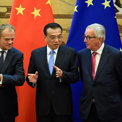 China's premier has been meeting the presidents of the European Commission and Council. We examine the changing relationship between China and the EU with Theresa Fallon, director of the Centre for Russia Europe Asia Studies. Also in the programme, our reporter at the Farnborough Air Show tells us how global trade tensions are causing turbulence there. As presidents Putin and Trump face off in Finland, we consider the possible outcome with our reporter in Helsinki. Plus our workplace commentator Stephanie Hare considers how company bosses can make their staff more creative. (Picture: Donald Tusk, Li Keqiang and Jean-Claude Juncker. Picture credit: Getty Images.)