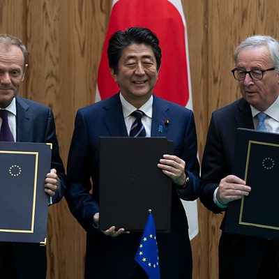 The European Union has signed its biggest free trade deal to date, with Japan. Shihoko Goto is senior associate for Northeast Asia at the research group the Wilson Centre in Washington, and tells us who the winners and losers from the deal are likely to be. Also in the programme, our reporter at the Farnborough Air Show considers the prospects for electric aeroplanes. We have a report from Hong Kong on the expensive marketplace for car parking spaces there. Plus, the most expensive film ever made in China, Asura, has been pulled from cinemas after a disappointing opening weekend. Shanghai-based journalist Kenrick Davis tells us more about the film. (Picture: Donald Tusk, Shinzo Abe and Jean-Claude Juncker. Picture credit: Getty Images.)