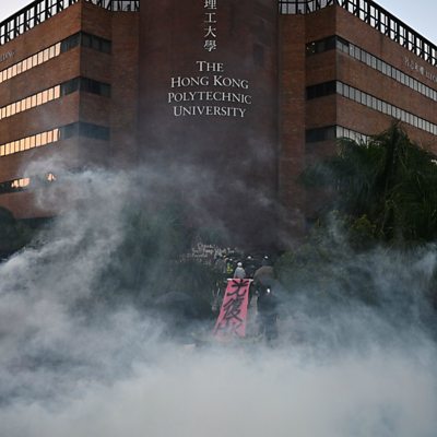Unrest continues in Hong Kong after more violent clashes between pro-democracy demonstrators and the police. Dozens of protestors have left the Polytechnic after more violent clashes with police. Throughout the programme we hear the views of Rachel Cartland, a long time civil servant in the Chinese city, who worked with the territory's Chief Executive Carrie Lam. Our other guest over the hour is Professor Peter Morici, from the University of Maryland in Washington and he has some interesting views on Ford unveiling an electric version of its iconic Mustang sports car. We also hear from motoring journalist Nikki Gordon-Bloomfield, from Transport Evolved, who took a ride in the car. We hear from the literary world after a tiny hand-made book written by Charlotte Bronte at the age of 14 was bought at an auction in Paris by the Bronte Society, which will ensure it returns to the North of England. As the UK prepares for one of the most uncertain general elections for many years we get an explanation of the policies of the Green Party, from its Brexit and finance spokesperson Molly Scott-Cato. (Picture: Hong Kong Polytechnic. Copyright credit Philip Fong.)
