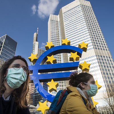 Europe proposes a boost to its budget by half a trillion euro, raised by borrowing money to regenerate the economy. Italy is coming out of lockdown, but many believe leaving their homes is going to bring things back to the way they were. With the cinemas closed in India, film producers have been forced to release the latest Bollywood blockbusters on Amazon - we'll look at how it may change Hindi language cinema. Plus, Uber announces job losses in some of its most ambitious projects. We talk about all this with guests Peter Morici, Professor of International Business at the R.H. Smith School of Business at the University of Maryland in Washington and Jeanette Rodrigues Mumbai Bureau Chief for Bloomberg. (Image: Two students wear face masks while they pass the Euro sculpture. Credit: Thomas Lohnes / Getty Images)