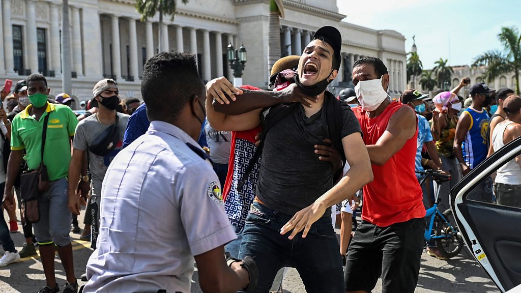 Cubans have been angered by an economic crisis, combined with anti-Covid measures. Thousands joined the biggest anti-government protests in the country for decades, and we find out more from Dr Emily Morris who is a development economist at University College London, specialising in the Cuban economy. Also in the programme, we have a wide ranging interview with Sundar Pichai, who is chief executive of search engine Google and its parent company Alphabet. Plus, there's controversy ahead of the Tokyo Olympic Games, about a new type of running shoe which has led to a recent surge in track and field records. The BBC's Ivana Davidovic asks whether a runner's authentic ability is becoming less important for success on the track. (Picture: A man is arrested during protests in Havana. Picture credit: Getty Images.)
